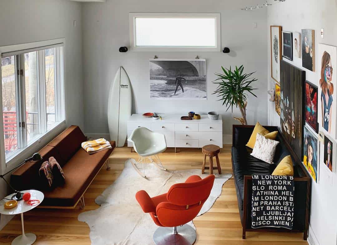 Отвлечь внимание от стен можно ярким ковром, расположенным по центру комнаты. Также подойдет интересная статуэтка или инсталляция, большое растение или даже потолочный камин