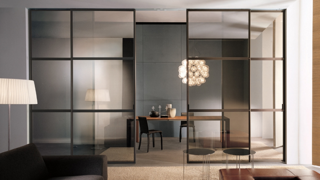 Для большой кухни, которая совмещена с гостиной подойдут раздвижные перегородки. Можно выполнить конструкцию в любом стиле, она отлично разделяет зоны и при необходимости «наглухо» разделяет комнаты, не пропуская запахи и шум, исходящие из кухни.