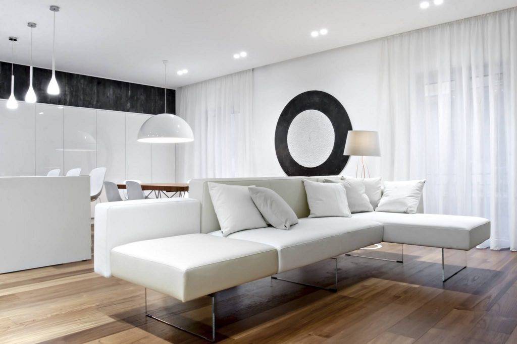Минималистичный и практичный хай-тек требует максимально свободного и светлого пространства. Именно в этом стиле будет уместна полностью белая гостиная при отсутствии контрастного декора.