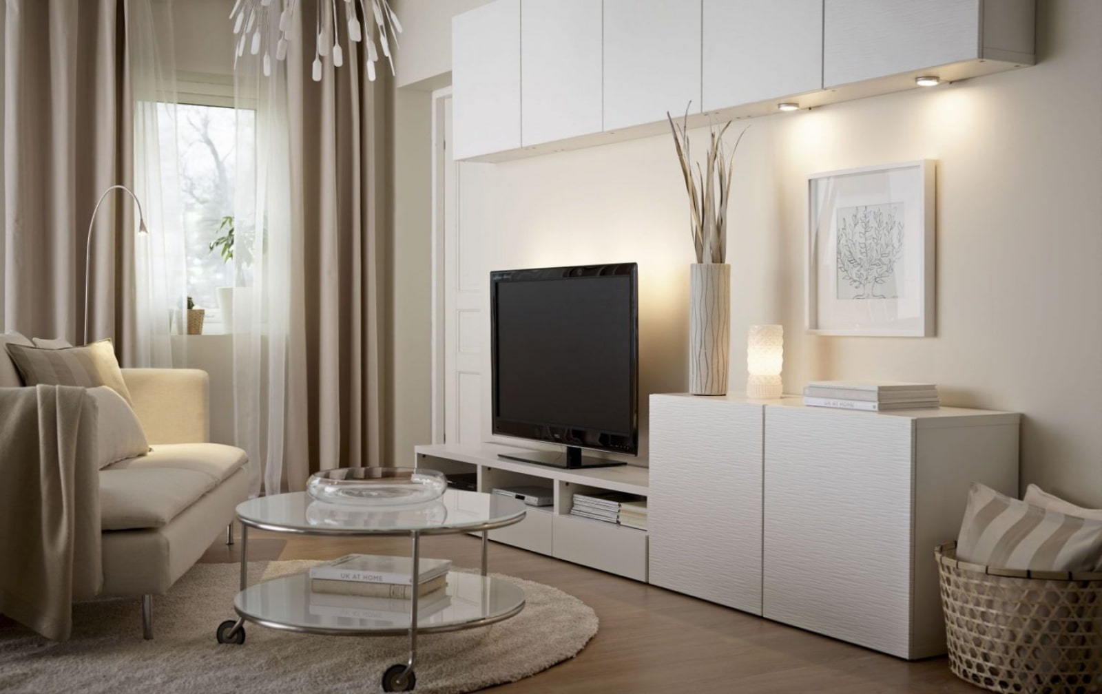 Небольшую корпусную мебель выбирают на один или два тона темнее стен, например, бронза или кофе с молоком. Можно сделать наоборот и выбрать мебель белого цвета. Идеально в светлую гостиную, впишется классическая стенка, и шкафы с применением закаленного стекла и зеркал.