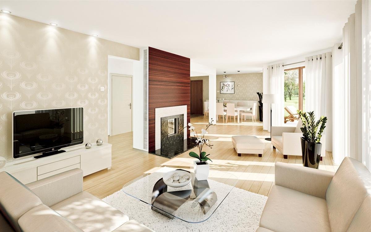 Можно возразить, что светлые цвета более маркие. Этот правда. Если в доме есть маленькие дети, животные, возможно, стоит задуматься о другом цветовом оформлении. В этом случае увеличить объем гостиной можно другими приёмами — с помощью глянцевого натяжного потолка, стеклянных перегородок и т.д.