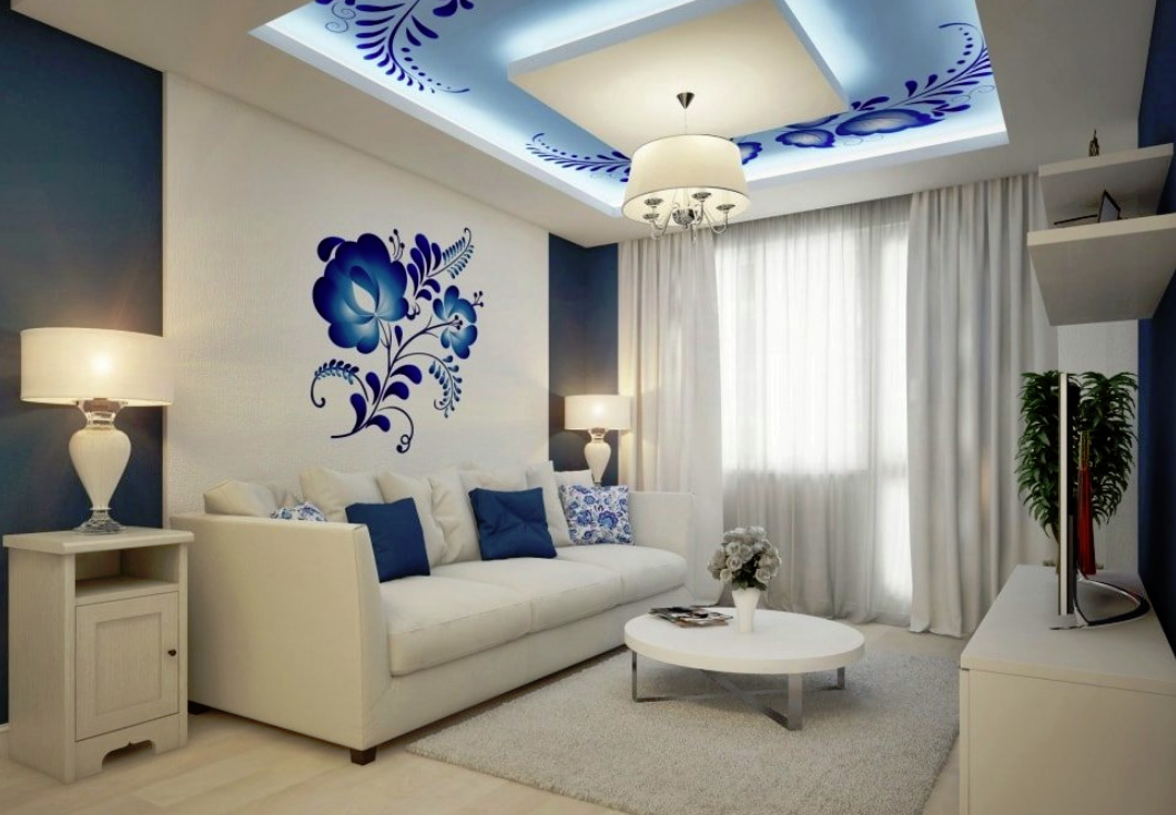 Потолок в гостиной можно сделать натяжным или гипсокартонным, вариант с классической побелкой также допускается.