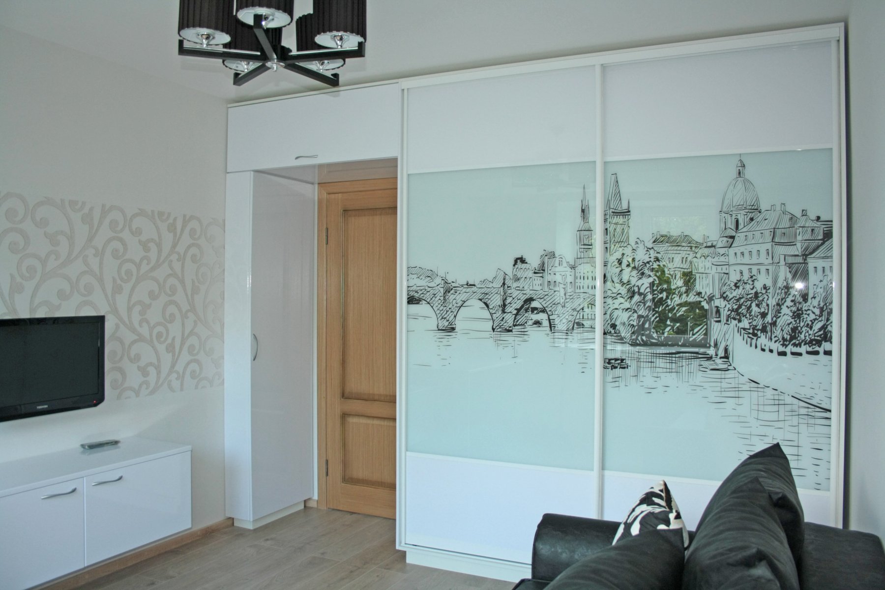 Белый шкаф в интерьере гостиной выполняет одновременно две функции – практическую и декоративную. При желании можно приобрести мебель, декорированную фотопечатью. Яркое пятно позволит сформировать эффект контраста, разнообразить обстановку.