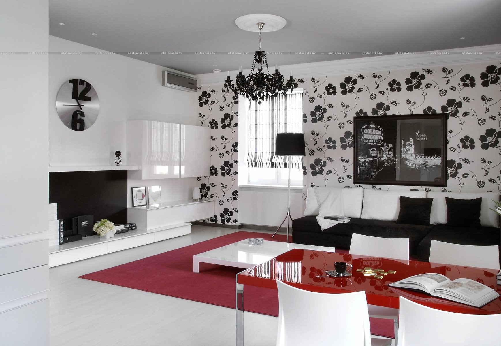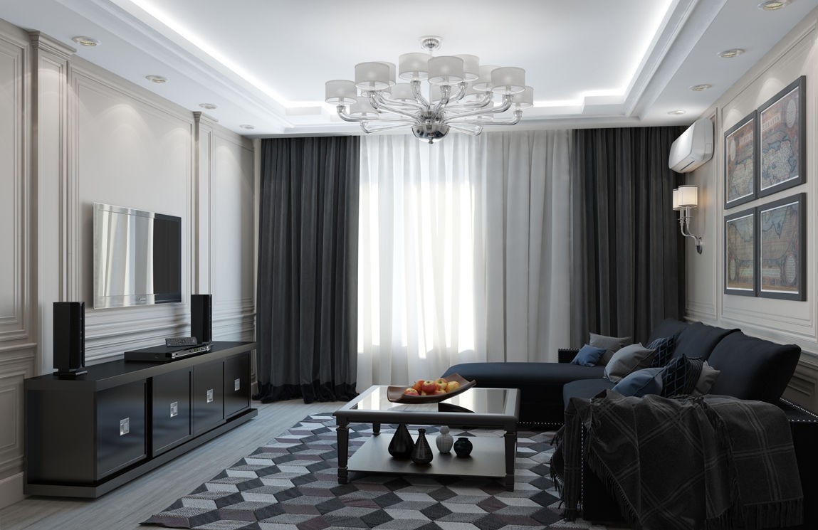 Можно также использовать черно-белые шторы, но в грамотных пропорциях. Это беспроигрышный вариант для дизайна гостиной.