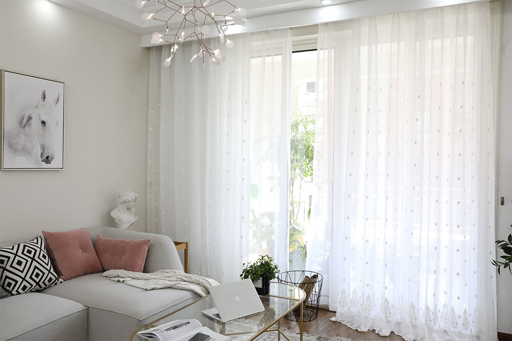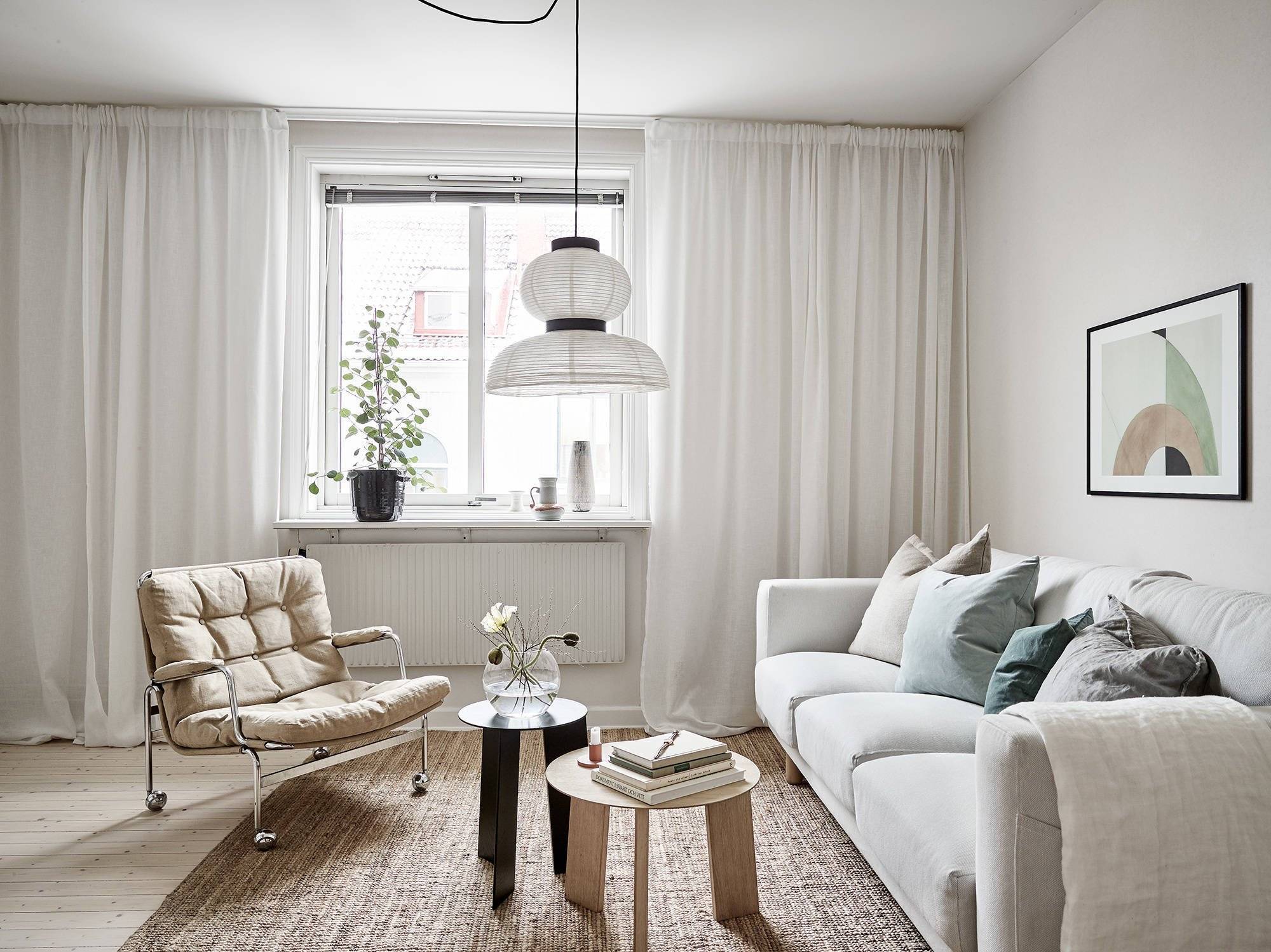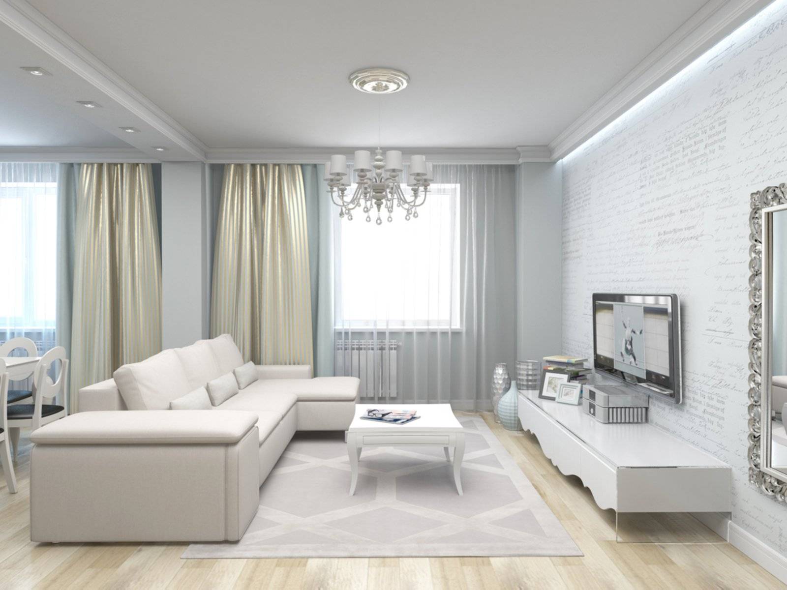 В интерьере гостиной, оформленной в светлых тонах, большое внимание уделяется освещению, особенно если в ней небольшие оконные проёмы. Окна рекомендуется занавесить с помощью прозрачного тюля или органзы и штор из лёгкого материала