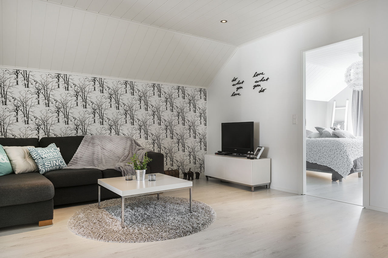 Как известно, основой отделки помещений в скандинавском стиле является сочетание белоснежных стен и потолка с деревянным напольным покрытием. Простота и практичность всех предметов мебели и декора в таких интерьерах стоит во главе угле. Скандинавский стиль ратует за использование минимального набора необходимой меблировки, дабы в комнате оставалось достаточно свободного пространства. Неизменное использование ярких предметов декора, разбавляющих белоснежно-древесную палитру помещения, гармонично завершает образ современной гостиной.