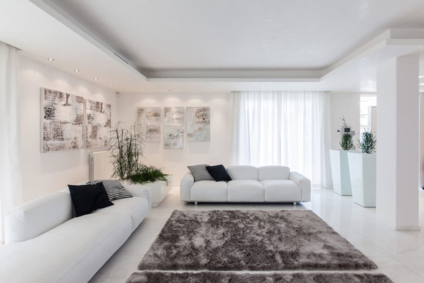 Между двумя белоснежными диванами постелите темно-шоколадный пушистый ковер