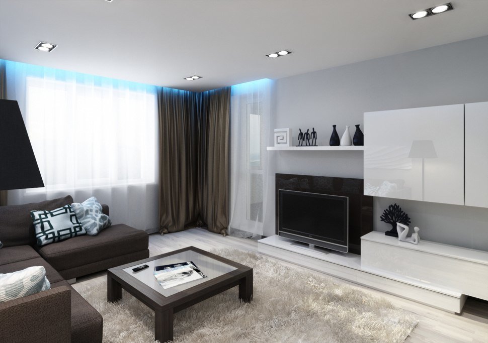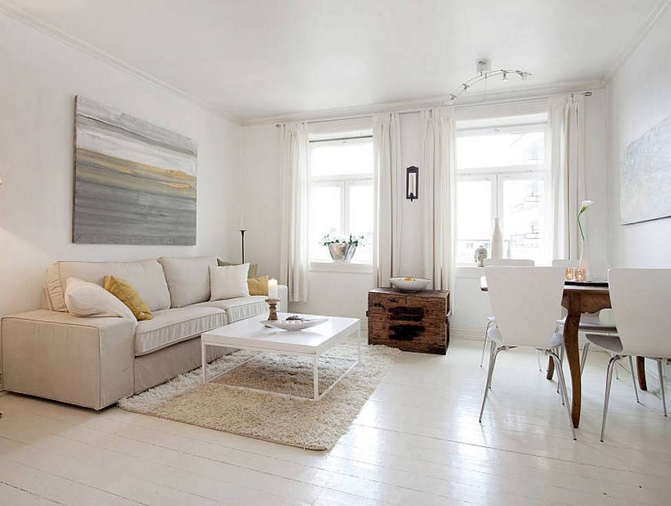 Если переборщите с излишками белой мебели, то потеряете всю легкость, которую вносят в дизайн светлые оттенки. Светлую гостиную обязательно разделите на несколько функциональных зон. Мягкую зону украсьте журнальным столиком, телевизором и мягким пушистым ковром с длинным ворсом. Диван можно украсить декоративными подушками темно-шоколадного цвета, а окна украсить такого же цвета текстиля. Еще расставьте несколько аксессуаров в виде ваз и статуэток.