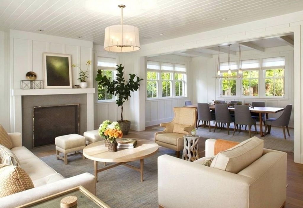 Неважно большой планируется комната или маленькой, в ней все равно должны гармонично размещаться все предметы интерьера на определенной дистанции друг от друга. Если гостиная будет совмещена с кухней или столовой, стоит условно наметить декоративную стену или арку, которая разделит пространство на разные функциональные зоны. В загородном доме с видом на красивые деревенские или лесные пейзажи, лучше остановить свой выбор на французских окнах в пол