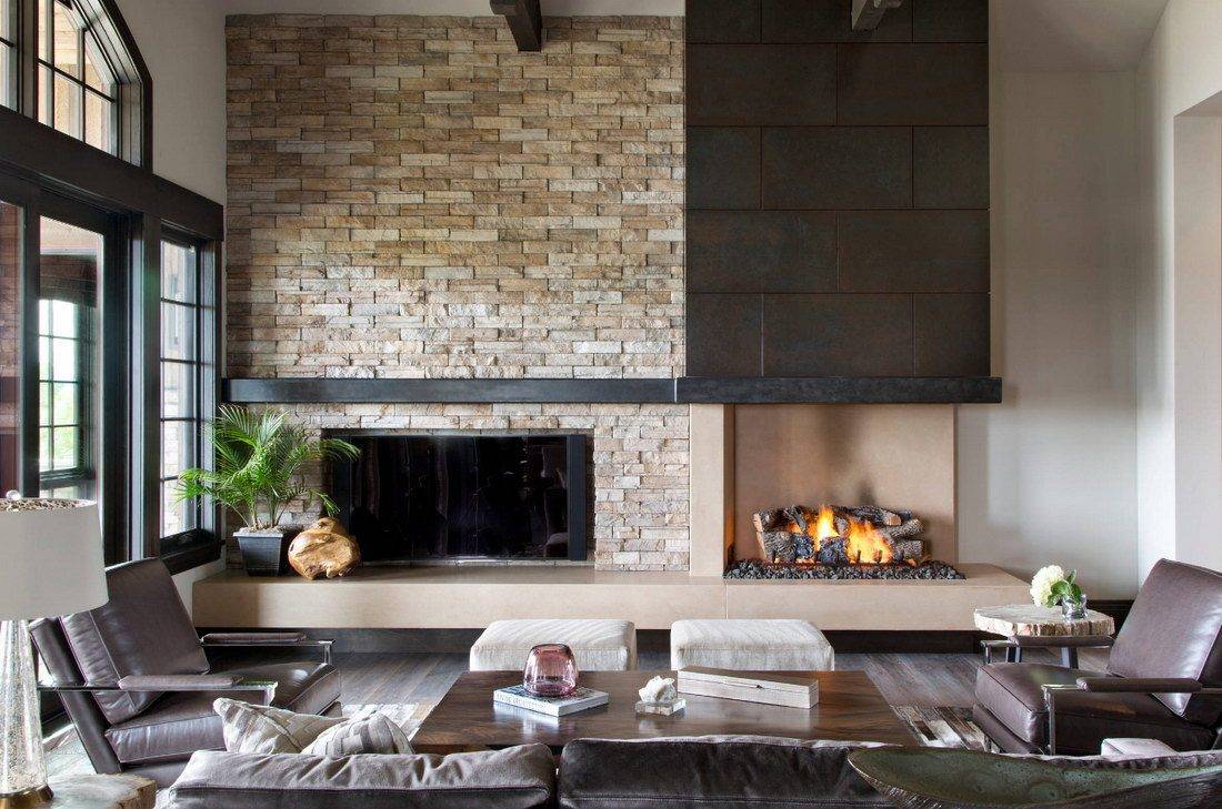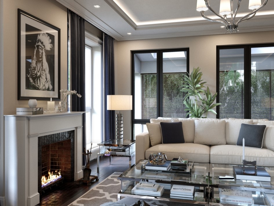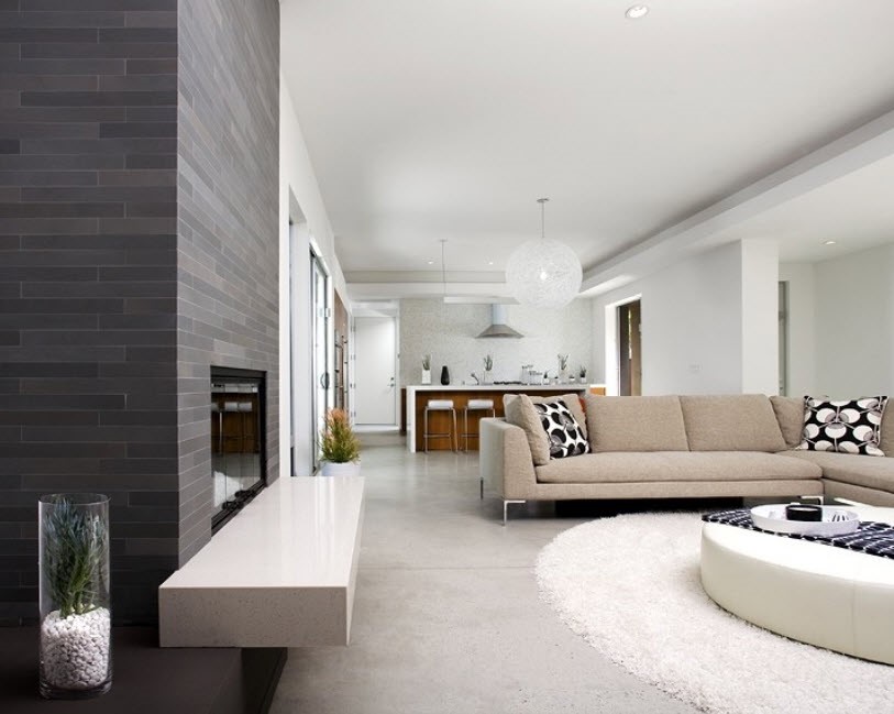 В современном мире стиль модерн в основном заключается в сочетании спокойных оттенков с контрастными тонами, а также простоте и рациональности. Кроме того, нередко в такой гостиной используется большое количество зеркал и стеклянных акцентов. Все это помогает визуально расширить пространство. Чаще всего такое оформление можно увидеть в частном доме. Ведь только в большой комнате можно установить камин по центру, тем самым сделав его главным очагом в доме. Если модерн был выбран для оформления квартиры, используйте фальш-камин. Но помните, что в таком случае топка должна быть ярко-выраженной с имитацией пламени и дров.