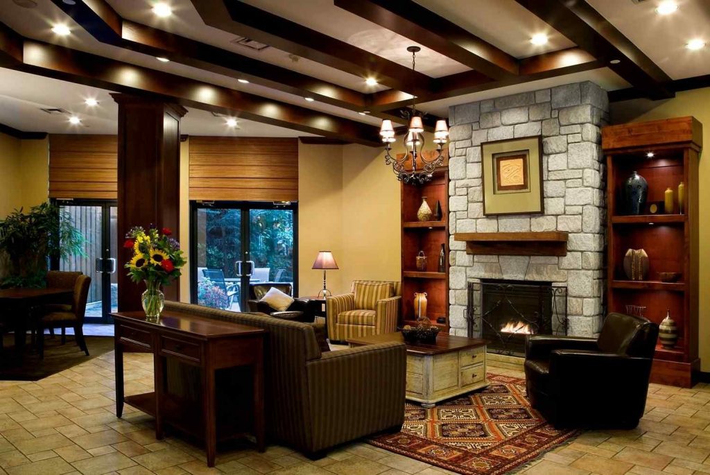 Данный стиль практически не встречается в уютных, небольших квартирах. Его преимущественно выбирают обладатели больших загородных домов. В них естественно предусмотрен массивный классический камин. Кстати в случае, если он выложен из камня, не стоит рассчитывать на ровные, гладкие линии. Что касается интерьера в целом, то гостиная должна быть оформлена со вкусом. Различные трофеи с охоты и оружие – самые распространенные декоративные детали подобных помещений.