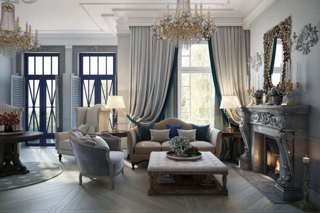В основном гостиные с камином оформляют в классическом стиле. Выглядит это невероятно красиво, изысканно. Только представьте, светлые стены, элегантная мебель из дерева, роскошный диван, лепнина, довольно большая люстра. Не удивительно, что в таком интерьере камин будет выглядеть наиболее уместно. Что касается его оформления, то чаще всего фасад выполнен из камня или дерева, а декор при этом отсутствует. Это позволяет добиться элегантной сдержанности. В основном над таким камином расположено крупное зеркало, картина или же полки с декоративными предметами.