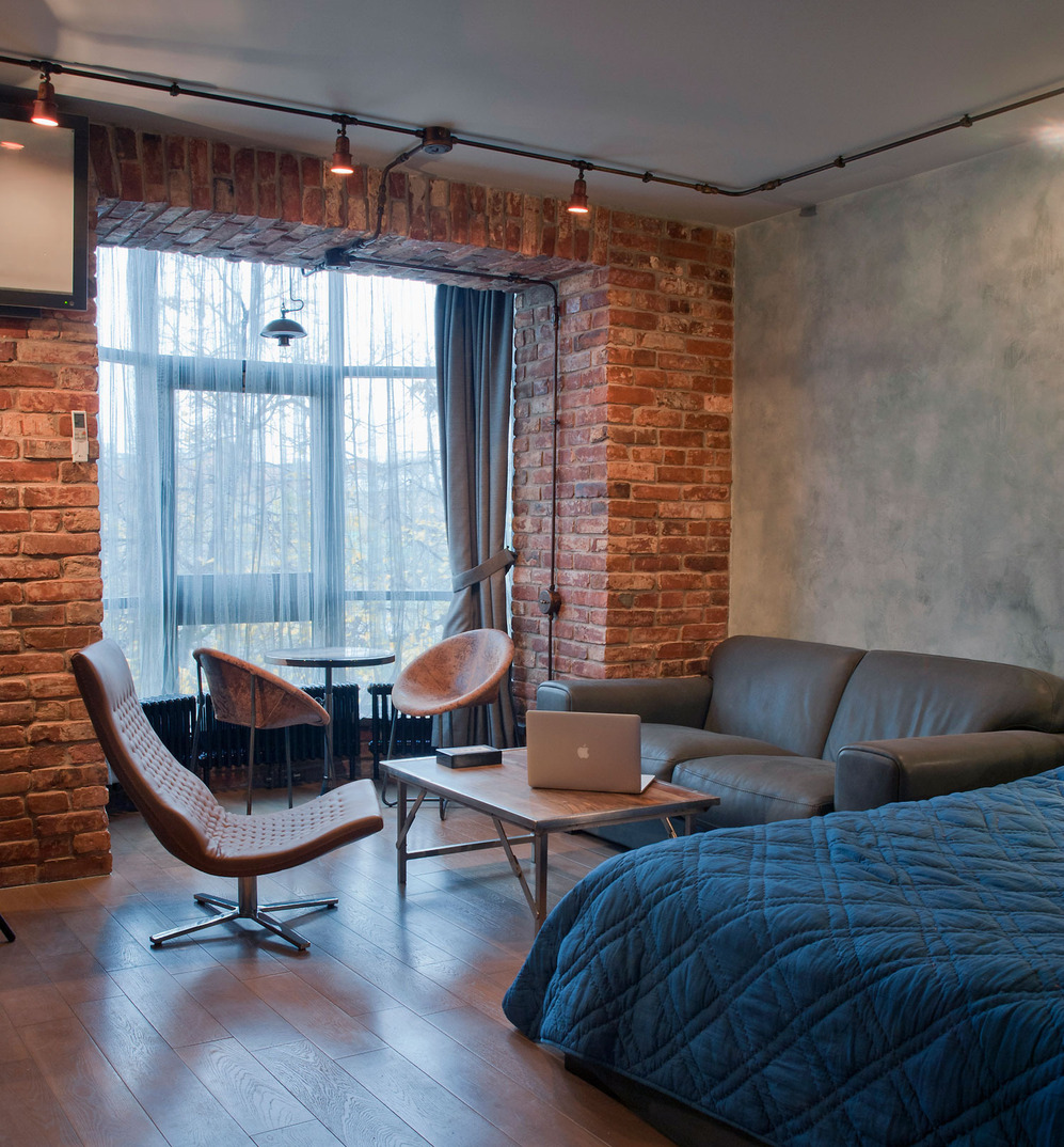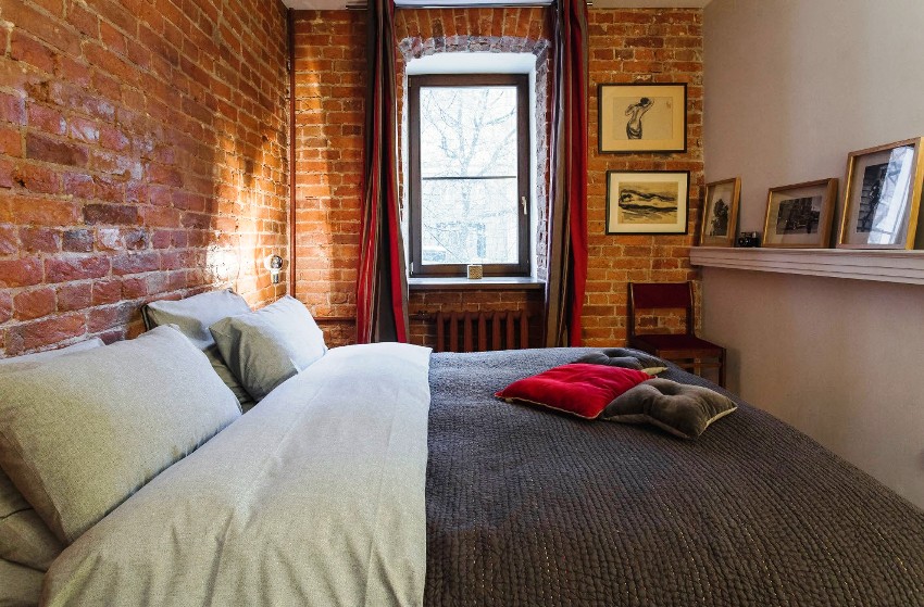 Грубые необработанные поверхности кирпичной кладки прекрасно впишутся в интерьер в стиле лофт спальни 12 кв. м