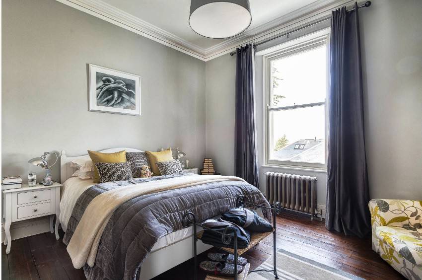 Стены спальни 12 кв. м лучше оформить в светлых нейтральных тонах, такой прием визуально увеличит площадь