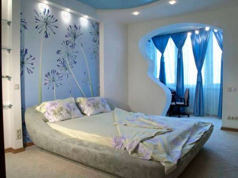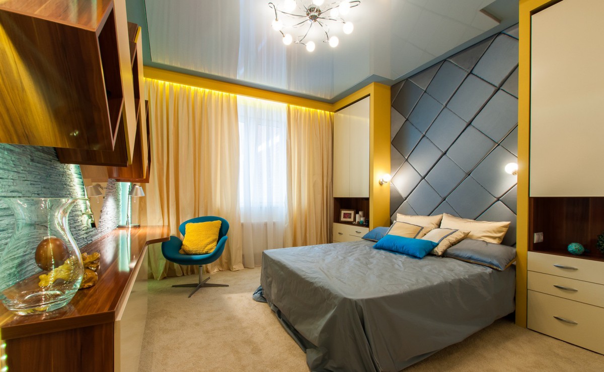 если потолочное покрытие в спальне в хрущевке будет с рисунком, то цветовая гамма остальной отделки должна придерживаться монохромности;