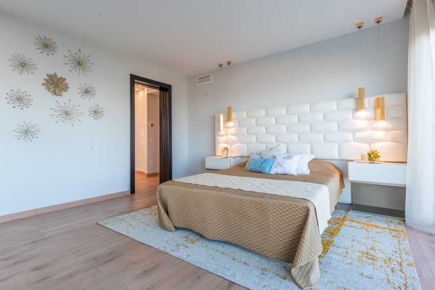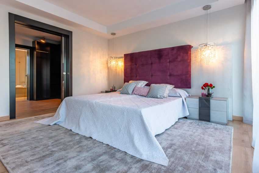 Планирование любой спальни начинают с установки кровати, но для спальни 20 кв данный совет может не сработать. Ведь если вы решите вместо шкафа-купе оборудовать отдельную гардеробную, то места для спальной зоны останется меньше. Поэтому выбирать спальное место и его расположение следует после того, как утвержден план спальни.