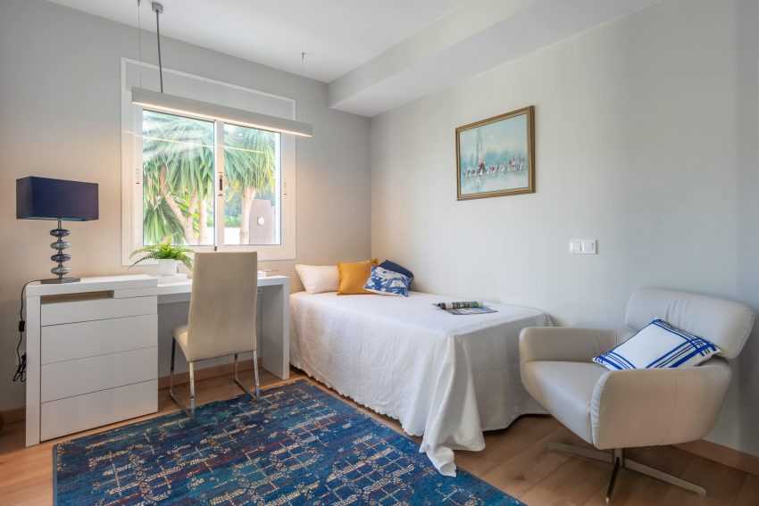 Часто в дизайне спальни также выделяют место для рабочей зоны. Организуйте стол на подоконнике или поставьте его у окна, если солнечные лучи не будут мешать вам при выполнении дел. В солнечных спальнях лучше расположить стол у стены, торцом к оконному проему. Если стол подойдет только легкий и компактный, то кресло может быть как классическим и невзрачным, так и акцентным.