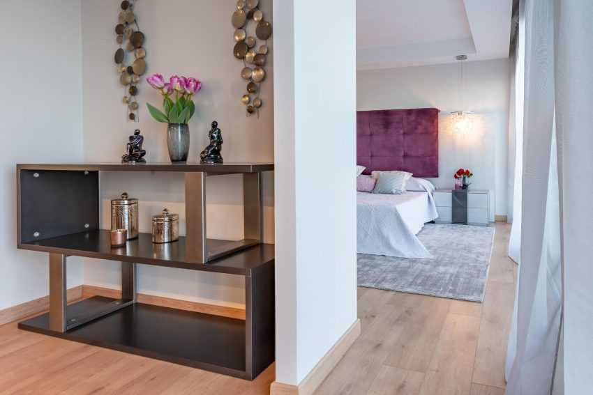 Разделяющая мебель может быть любой — популярностью пользуются гардеробы и разнообразые этажерки