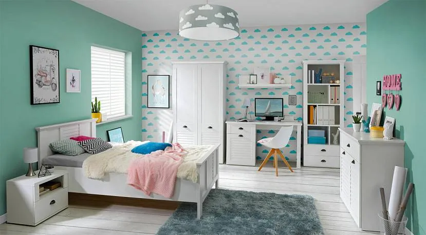 - Яркое комбо. Белый цвет способен визуально освежить, разбавить 1-2 оттенка «вырви глаз»: при этом в пару к холодной отделке (синий, зеленый, фиолетовый) выбирайте бриллиантовый или снежный. Комнату с яркими теплыми тонами (желтый, оранжевый, красный) лучше оформить такой же теплой белой мебелью: кокос, миндаль, антик.