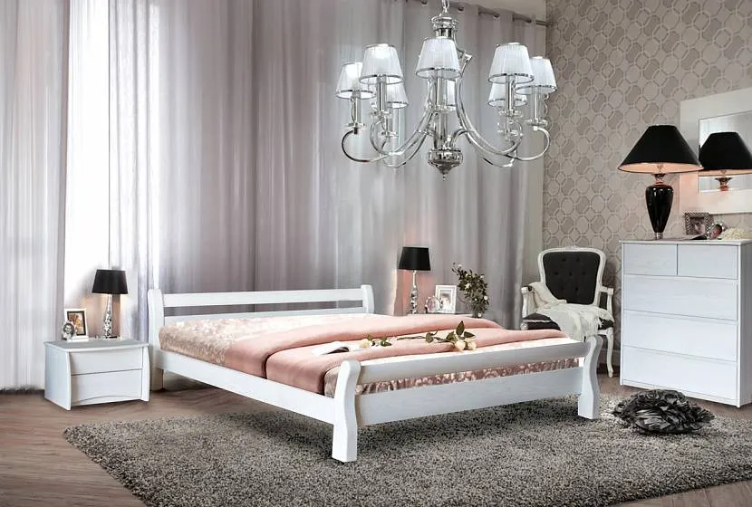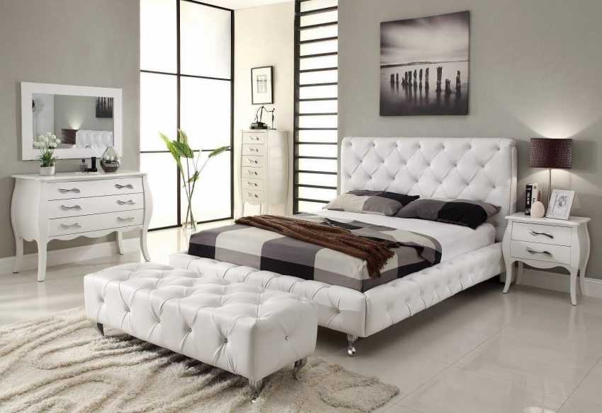 Для комнат с белоснежным интерьером в основном отдают предпочтение мебели, изготовленной под заказ. Обычно она выполняется по дизайнерским идеям. Для нежных спален приветствуется установка исключительно натурального гарнитура. Это может быть дерево и его составляющие. В отдельных случаях допускается установка кроватей и прикроватных тумб с металлическими фигурными ножками.