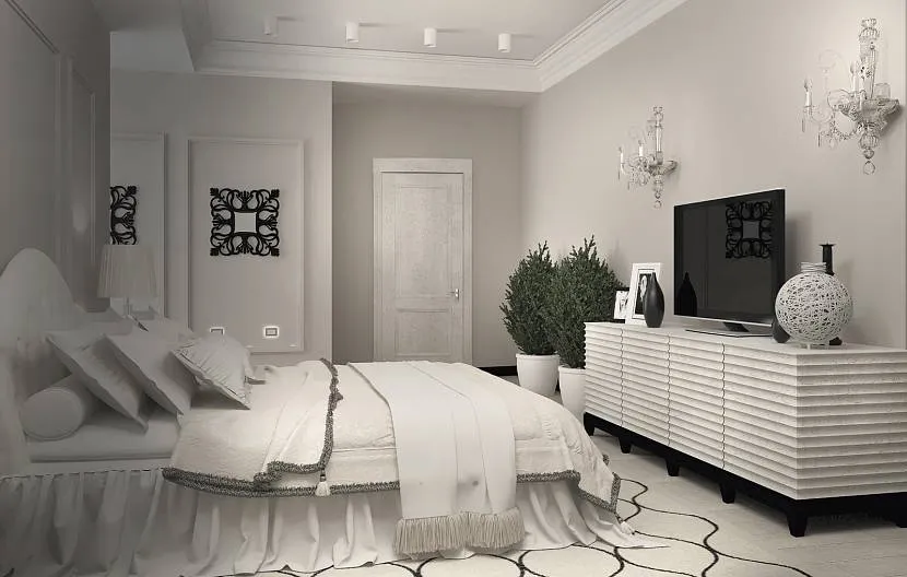 Это могут быть медовые, перламутровые тона, цвет сливок и слоновой кости; особую осторожность следует проявлять используя контрастный черный цвет. Большое количество черных акцентов создает впечатление нахождения в неком геометрически правильном пространстве; не зацикливайтесь на белоснежной гамме – играйте с молочным, кремовым, жемчужным полутонами, используйте цвет топленого молока; выбирайте цветное постельное белье – оно станет разбавляющим белизну акцентом; расставьте аксессуары из дерева, серебра и фарфора; развесьте на белом фоне картины и фотографии
