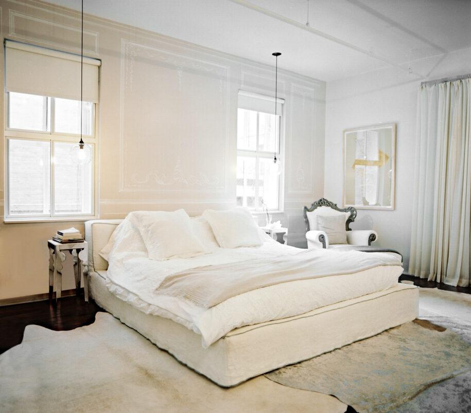 Холодный белый интерьер можно «согреть» теплыми цветовыми акцентами в виде аксессуаров, текстиля и ковриков из натурального меха. Имея хороший вкус и фантазию, можно почти «безоттеночный» цвет обыграть так, что привычная спальня заиграет новыми красками. Хорошие примеры – фото белой спальни в разной стилистике.