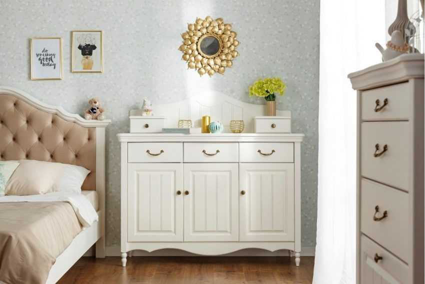 Кроме спального места, шкафа и комода в комнату можно поставить трельяж или туалетный столик.