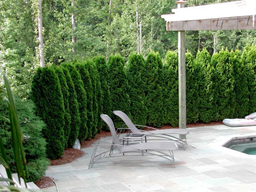 Живая изгородь из туи — это не только красиво, но и полезно. Данное растение относится к лечебным и выделяет эфирные масла, которые благоприятно воздействуют на организм человека. Фитонциды — вещества, что выделяет растение, оказывают противовирусное воздействие на организм.