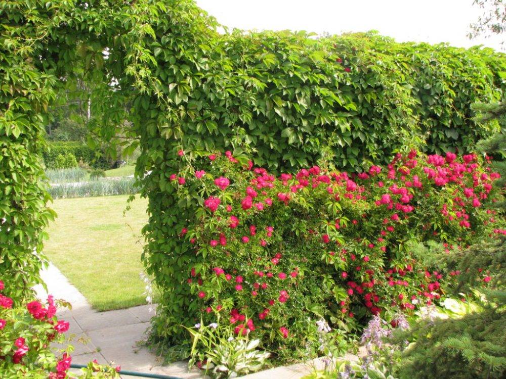 Декоративная живая изгородь — для нее используется и дикий виноград плющевидный. Можно, конечно, посадить и обычный виноград, но тогда существует опасность получить в изгороди дыры, которые появятся после того, как любители винограда захотят полакомиться сочными гроздьями. Так что лучше дикий виноград — ягод у него практически нет.