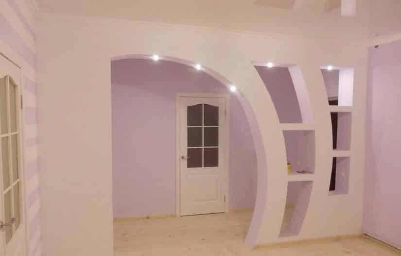 Вполне реально спроектировать и смонтировать из гипсокартона стены, имеющие сложные декоративные и полезные формы, например арочные дверные проемы или функциональные ниши и шкафы, позволяющие отказаться от покупки мебельных аксессуаров.