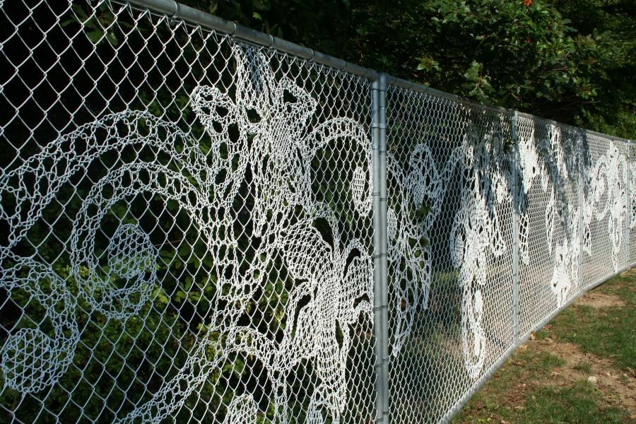 Самый простой вариант декора забора на даче – расписанная сетка-рабица. Окрашивать ее можно полосами, геометрическими фигурами, отдельными узорами. Фантазия здесь не ограничивается. Также «расшивают» забор из сетки рабицы тонкой проволокой по тем же принципам, что выполняется вышивка на ткани. Получившийся орнамент раскрашивается.