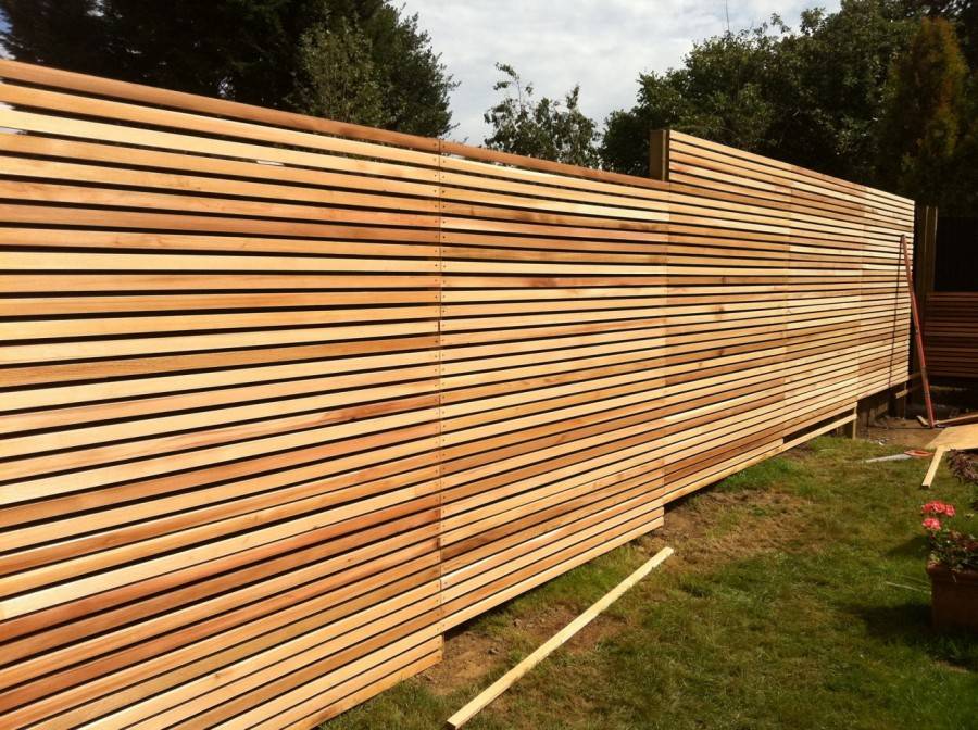 Прибейте или же посадите на шурупы приготовленные заранее доски для деревянного ограждения. Сделать можно «глухой» забор, доски прибивая встык, а можно между ними оставить небольшое расстояние (приблизительно от 1 до 5 см). Можно также вместо досок применять тонкую рейку (сечение — 2х5 см) и построить частокол – как желаете.