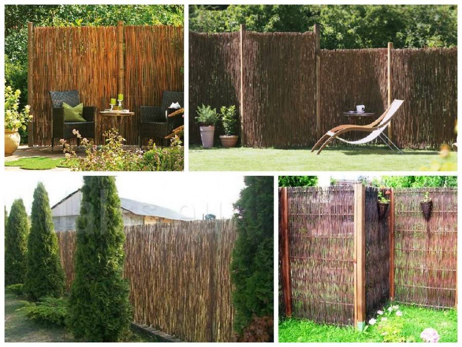 Плетеный забор используют как для огораживания всего участка, так и для выделения зон внутри него. В качестве материала используется лоза, ивовые ветви, орешник, камыш. Выбирают длинные и гибкие ветви и переплетают их, располагая параллельно друг другу. В качестве опоры и поперечной основы используют тонкие столбики, вкопанные в землю перпендикулярно ей.