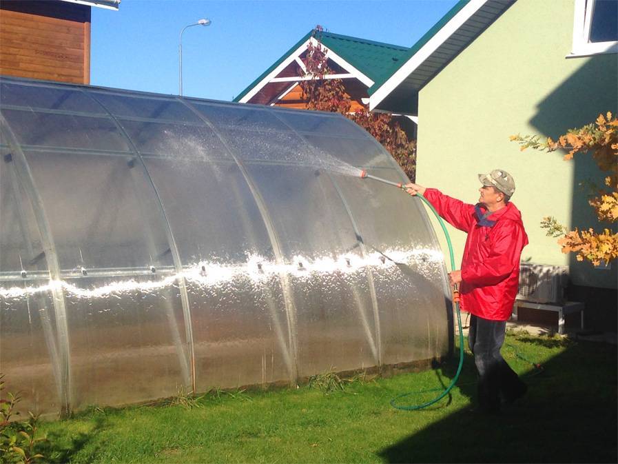 Осенью важно очень хорошо вымыть с внутренней стороны все стенки теплицы водой с любым неагрессивным моющим средством для мытья поверхностей. Нужно особенно тщательно промыть углы