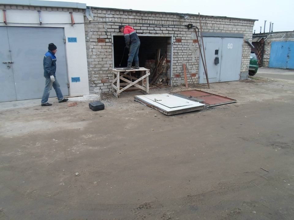 Предварительно необходимо демонтировать верхнюю балку гаражных ворот, потом ее нужно снова установить на цемент в рядах кирпичной кладки.