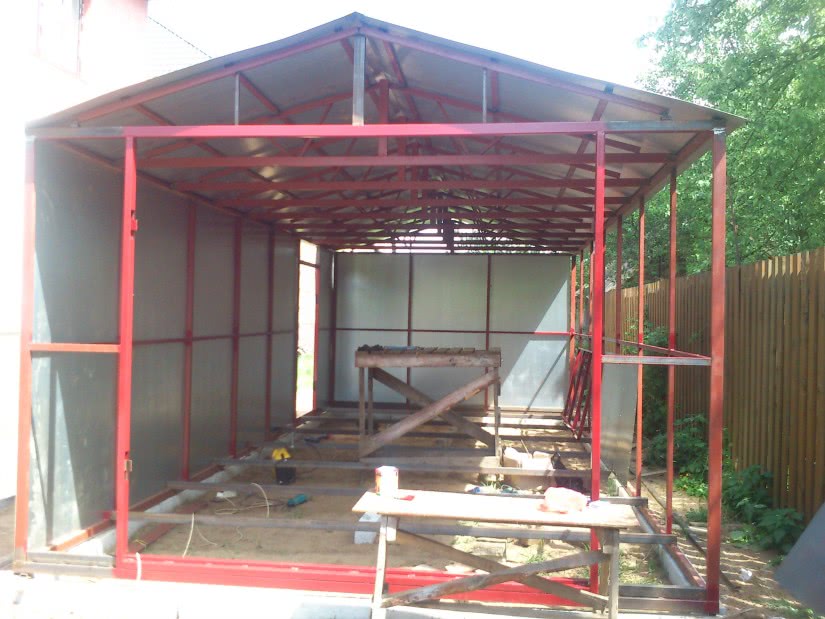 Сооружение каркаса. Для этого потребуются металлические уголки нужного размера или деревянные брусья толщиной примерно 10-12 см.Сначала собирают каркас для стен, для этого профили соединяются между собой саморезами в прямоугольник, который по размеру будет соответствовать боковой стене гаража. Через каждые полметра устанавливаются дополнительные ребра каркаса, а стенки стягиваются перфорированной лентой по диагонали. По такой же технологии происходит сборка торцевых стен. Каркас из кровли делают из широкого профиля, чтобы в зимнее время крыша выдержала дополнительную нагрузку снега. Профиль соединяют в прямоугольник и дополнительно усиливают ребрами, которые выполняют роль обрешетки. Далее на основание, которое было подготовлено заранее, устанавливаются все элементы каркаса и соединяются между собой. Обязательно стоит проверить при помощи строительного уровня, ровно ли установлена конструкция. Крыша крепится к стенам саморезами.