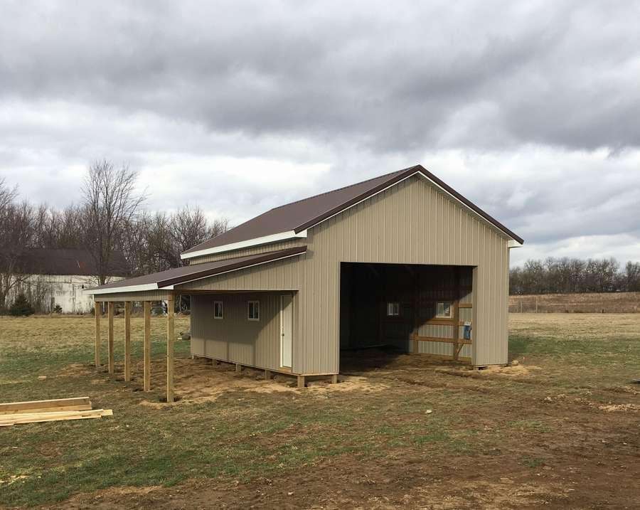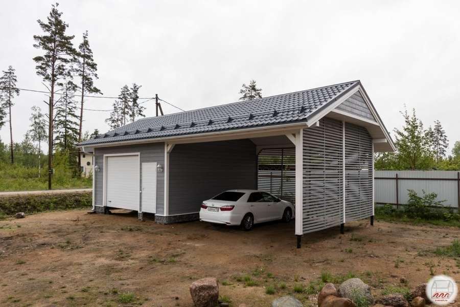 Вместительный каркасный гараж с небольшим открытым боковым навесом. Каркас данной конструкции выполнен также из деревянных реек и брусьев. Сооружение обшито профнастилом. Каждый из брусьев являющийся частью каркаса погружена на метр вглубь почвы.