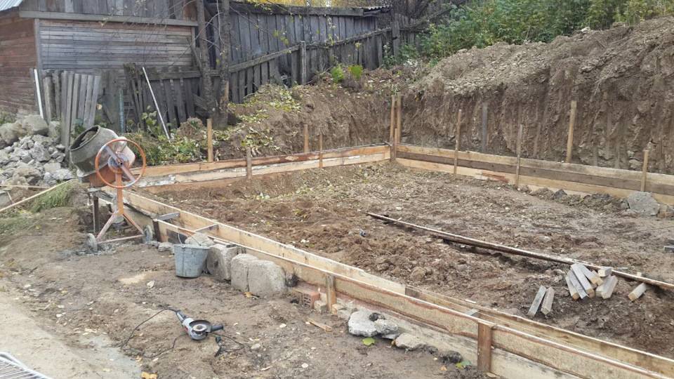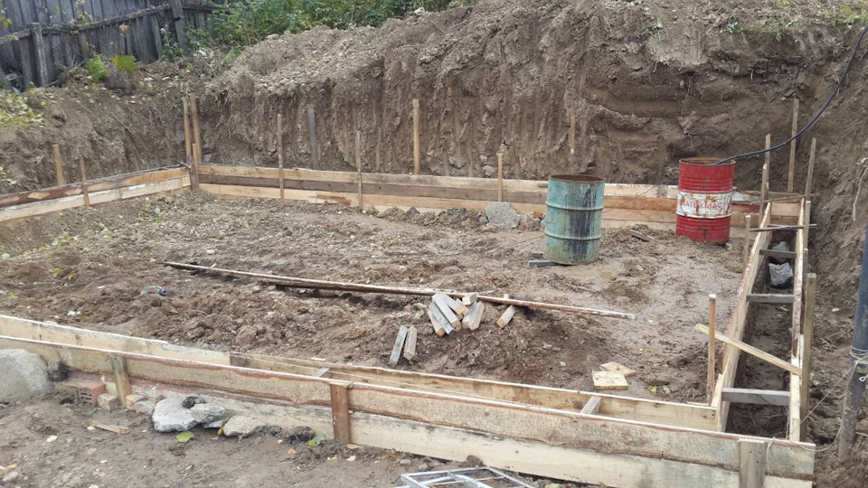 После вырывания траншеи или котлована нужной глубины, по периметру всего будущего фундамента устанавливаются деревянные или металлические щиты, по высоте равные размеру фундамента.