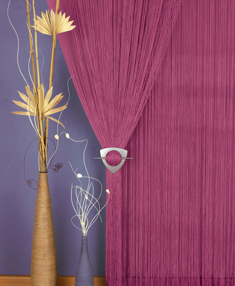 Идея такой драпировки родилась в странах Востока. Такие шторы сделаны из тканевых отдельно висящих нитей. Такие нити украшают изящными элементами из бисера, бусин, пайеток и подобного. Нити закручиваются в спирали, используют разную ширину и материалы, что дает возможность использовать такие модели в любых стилях.