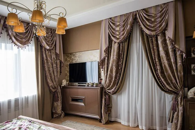 Такие шторы представляют собой многослойную горизонтальную тканевую драпировку в верхней части. Используют такие шторы для декора спален или гостиных в стиле классицизм, романтизм, барокко, рококо, прованс и даже неоклассицизм.