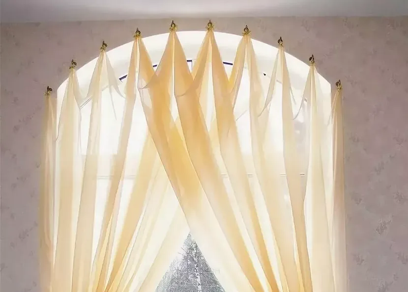 - Точечное крепление. Идеально подходит такой вариант на полукруглые оконные рамы. Условно занавески приклеиваются к стене над окном полукругом. Получаются тонкие красивые складки. Если рядом находится два таких окна, то шторы можно скрепить между собой с помощью декоративной ленты и сделать красивые симметричные подхваты.
