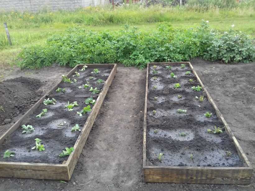 Такие грядки имеют бортики из досок высотой 20-40 см. Из битого кирпича или плитки между ними делается дорожка, чтобы меньше распространять почвенную инфекцию.