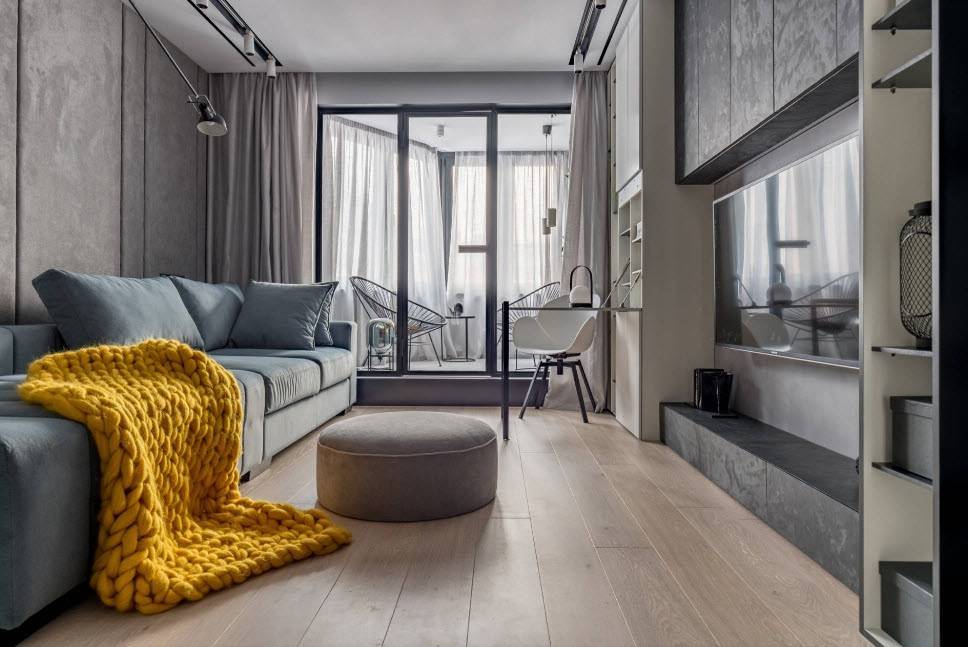 Менее эргономичный вариант — проемы вырублены по центру стен или в дальних углах смежных перегородок. Чтобы обыграть такую планировку, применяют диагональное зонирование — в одном углу ставят диван, во втором располагают любую зону — для работы, чтения, спорта. Телевизор подвесьте на кронштейн к стене или потолку.