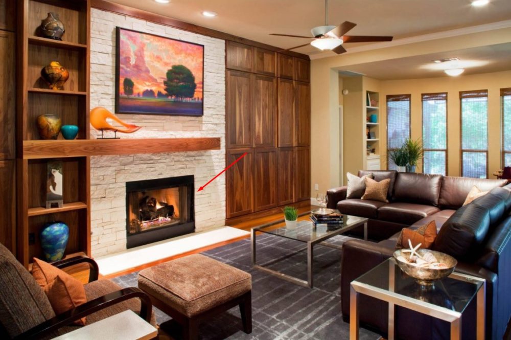- Напротив дивана. При симметричной расстановке мебели по бокам камина ставят 2 одинаковых шкафа. Или встраивают телевизор в широкую стенку.