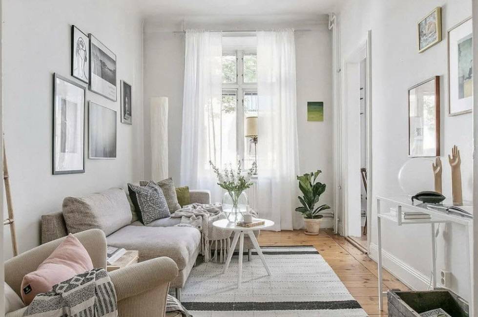 Скандинавский стиль – символ чистоты и воздушности. Нордический интерьер словно веет холодом, покоряя обилием белого цвета. Сделать дизайн узкой гостиной не скучным позволят яркие подушки, оригинальные коврики и натуральные шторы.