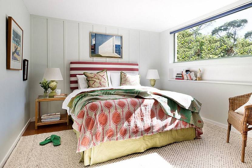 Обои в полоску в узкой спальне олицетворяют собой элегантность, кроме того, они способны моделировать пространство. Широкий белый бордюр под потолком не просто придает завершенность дизайну интерьера, но и расширяет потолок, а значит и всю спальню.