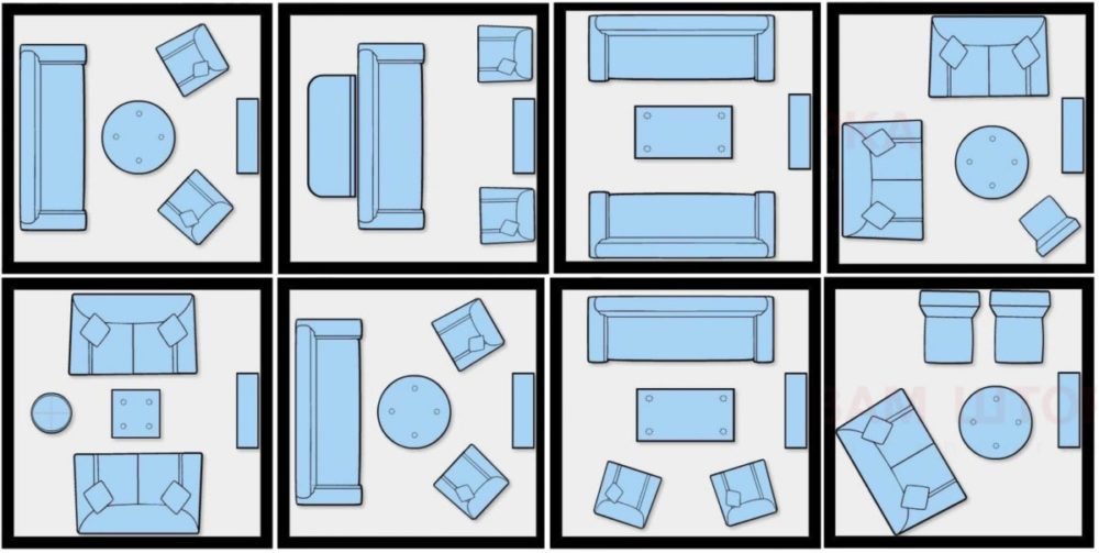 При расстановке мебели надо оставлять наиболее подходящее расстояние между предметами интерьера. Между компонентами сохраняют от 1,8 до 2,4 м, иначе передвижение по комнате будет некомфортным. В маленьком пространстве упор делают на функциональности, а дополнительные элементы используют при наличии свободного места.