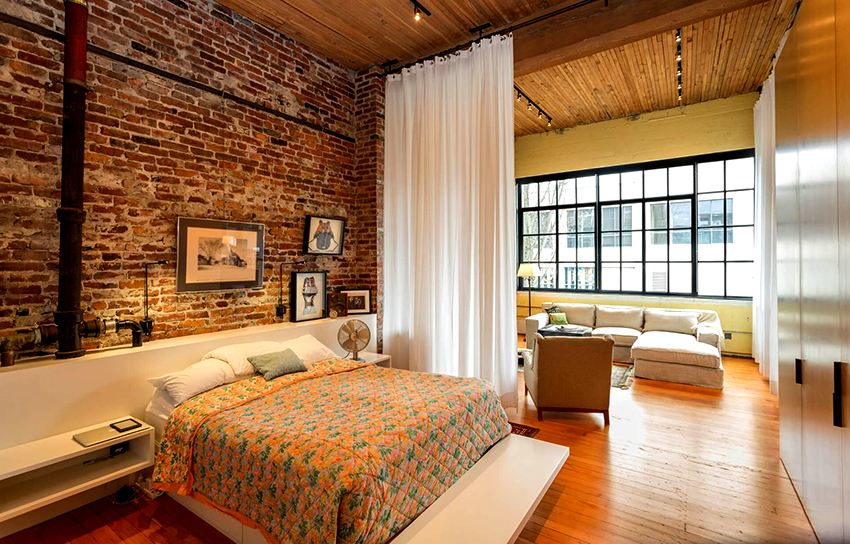 Стиль лофт ориентирован на оригинальности идеи, открытости и свободе. Целостность стиля можно поддержать любыми перегородками.