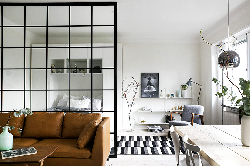 Современное зонирование гостиной и спальни стеклянной перегородкой