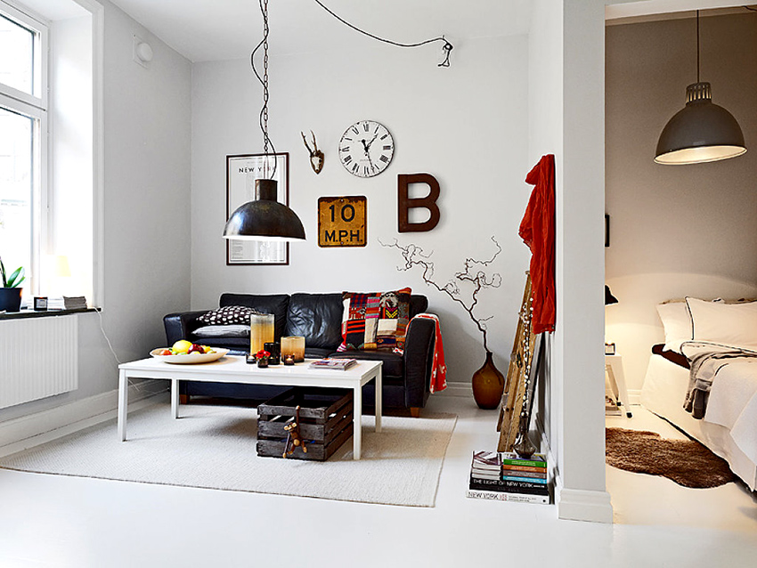 Для небольшой, разделенной комнаты не выбирайте темную громоздкую мебель. Они зрительно уменьшат и без того маленькую комнату. Лучше отдать предпочтение легкой кровати и легкому дивану. Эти вещи можно дополнить столиками и полками из стекла или светлого дерева.